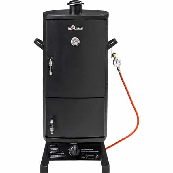 Betrieben wird der Gasgrill El Fuego Portland mit handelsüblichem Propangas. Die Temperatur können Sie mit dem Gasregler des Gerätes perfekt regulieren, sodass Sie jede Zutat nach Belieben zubereiten können. Der El Fuego Portland arbeitet in einem Temperaturbereich von 80 bis 160 Grad Celsius. Da das Gerät sich jedoch in erster Linie zum Smoken eignet, sollten Sie eine Temperatur von 110 bis 120 Grad Celsius möglichst nicht überschreiten. Beim Smoken steigt der heiße und feuchte Rauch langsam auf, bevor er durch einen kleinen Schornstein abzieht. Durch den heißen Dampf können Fleisch und Fisch besonders gleichmäßig garen. Da das Grillgut nach der Zubereitung eine würzige Rauchnote aufweist, wird der Gasgrill auch gerne als Smoker bezeichnet.